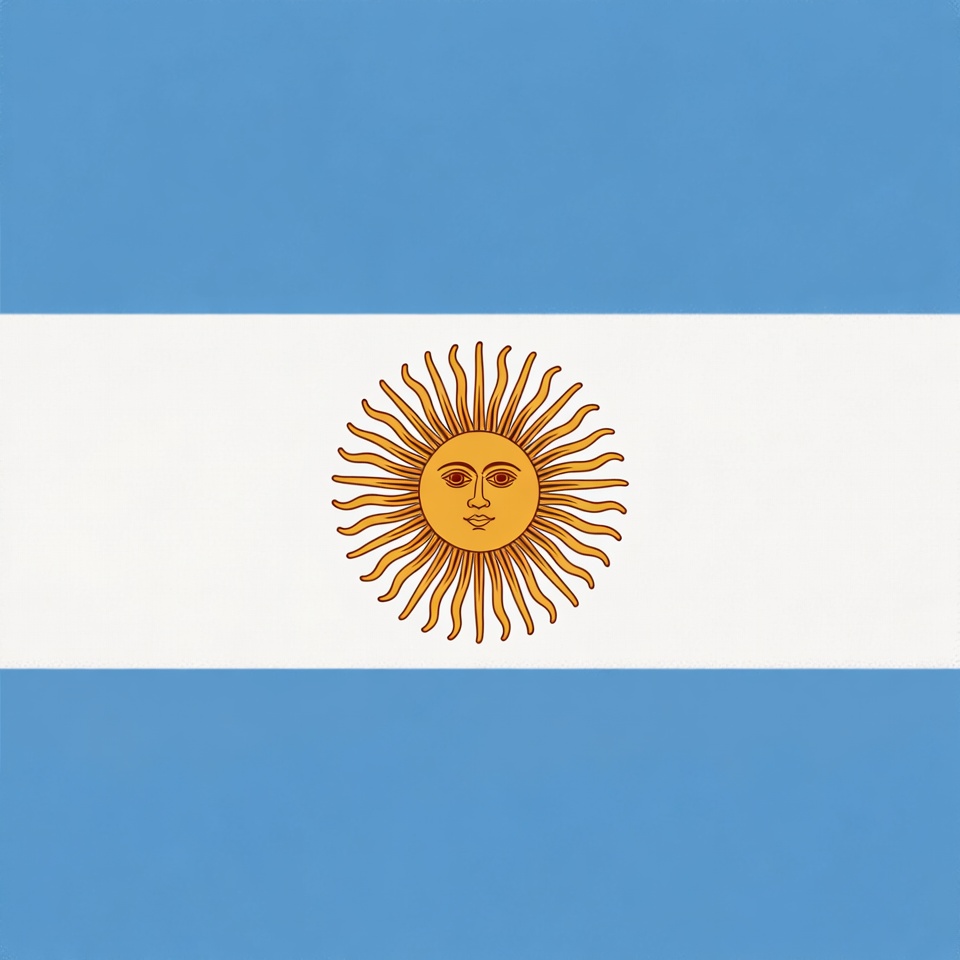 The flag of Argentina features three horizontal stripes in light blue, white, and light blue. Centered on the white stripe is the Sun of May, a golden sun with a human-like face and radiating rays. The design is simple and bold against the solid colored background.