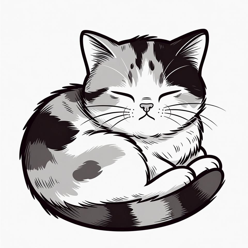 adorable cat, animal drawing, black and white, calico cat, cartoon kitten, cat, clipart, curled up, cute kitten, feline, fluffy fur, illustration, isolated background, line art, paws, pet illustration, sleeping kitten, sleepy cat, whiskers, kitten