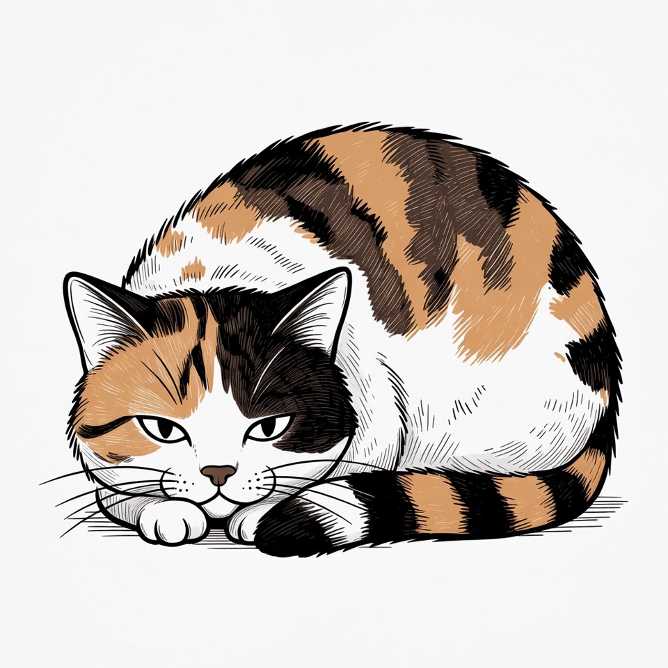 A detailed illustration of a calico cat curled into a ball with its head resting on its paws. The cat features a tri-color coat of orange, black, and white fur with expressive eyes partially closed. It sits on a plain white background.