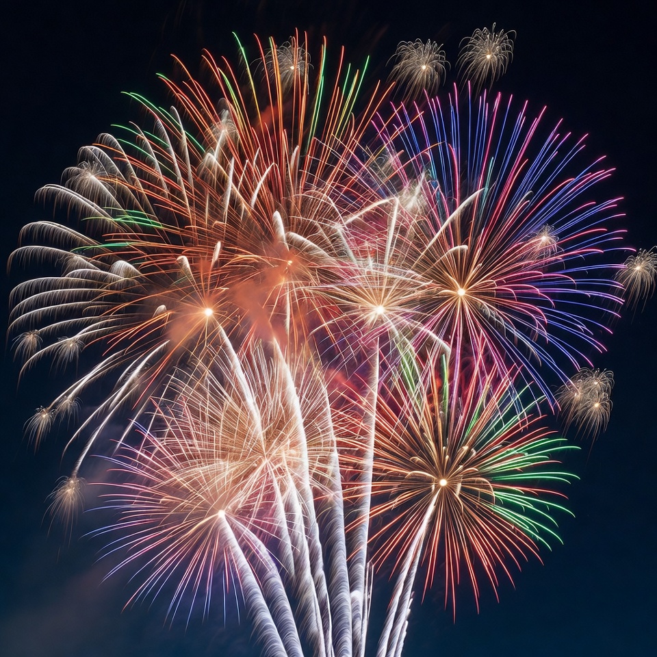 aerial fireworks, blue fireworks, bursts, celebration, colorful fireworks, dark background, exploding fireworks, festival, fireworks display, green fireworks, light trails, night display, night sky, orange fireworks, pyrotechnics, red fireworks, sparks, vibrant colors, white fireworks, fireworks