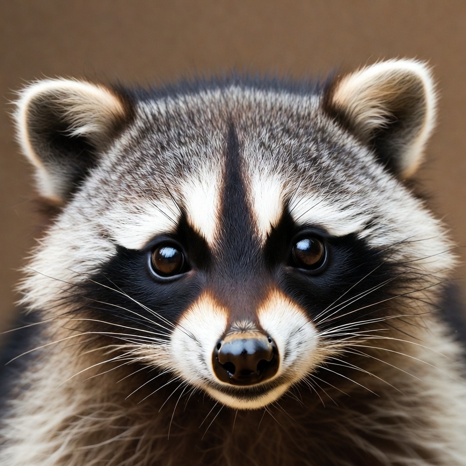 A raccoon with distinctive black mask around its eyes stares directly at the camera. Its fluffy gray and white fur is detailed, with large expressive eyes and small black nose. The animal is centered against a plain brown background.