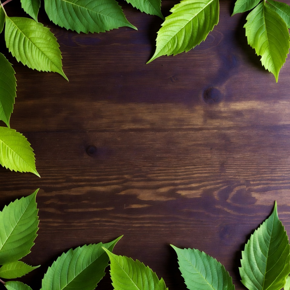 autumn leaves, border frame, flat lay, fresh leaves, glossy leaves, isolated background, leaf border, leaves, nature, plant leaves, serrated leaves, top view, vibrant green, wood background, wooden table, green leaves