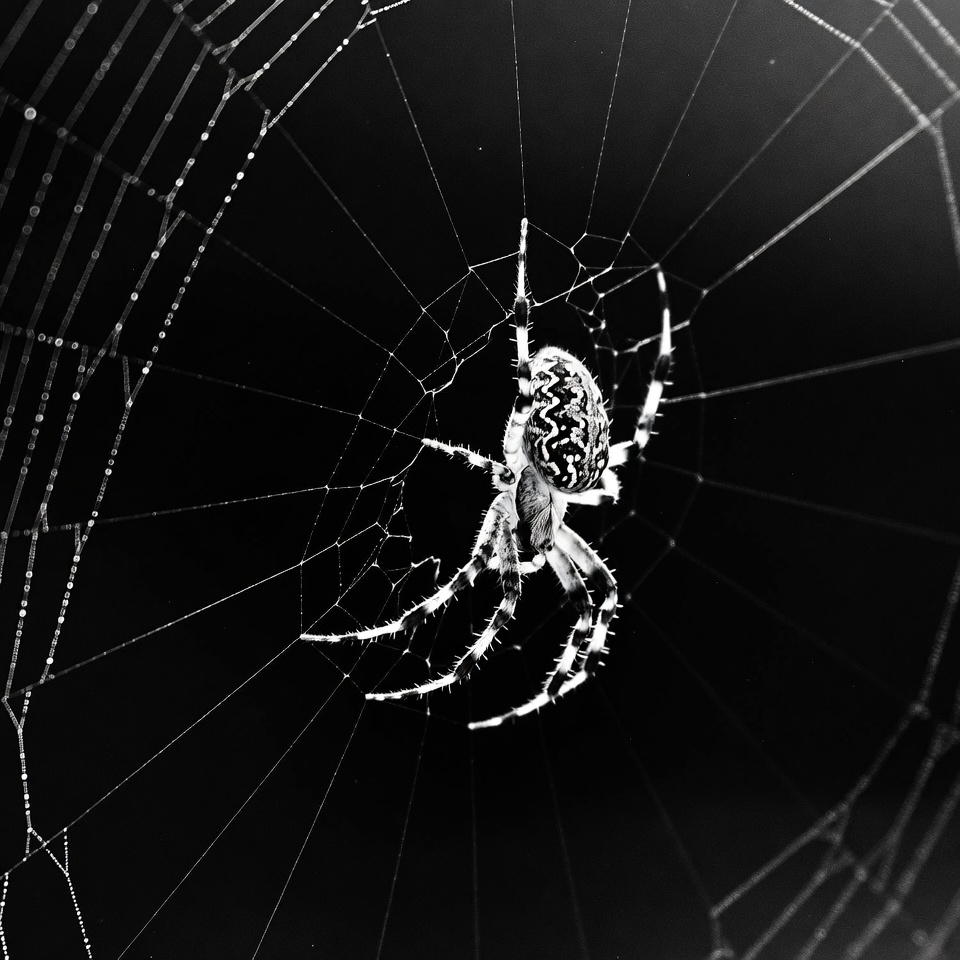A spider with a patterned body sits in the center of its intricate web. The image is captured in black and white, highlighting the delicate strands of the web against a dark background. The spider's legs are spread out, gripping the web.