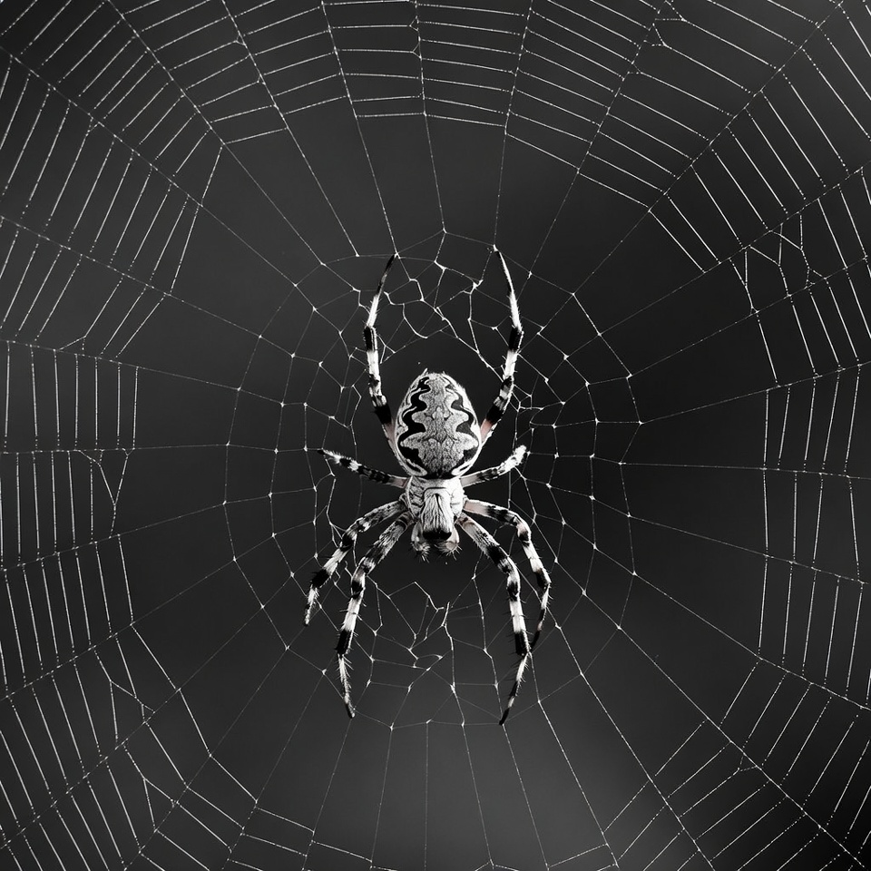 A black and white spider with zigzag patterns sits in the center of a large, intricate spider web. The web strands radiate outward against a dark background. The spider has long legs poised on the silky threads.
