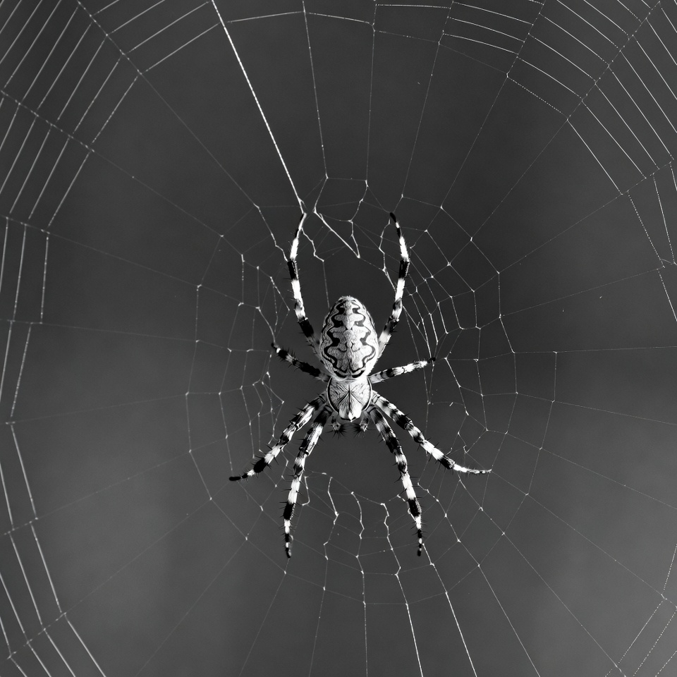 A black and white image shows a spider with black and white striped legs hanging upside down in the center of its intricate web. The spider has a patterned body with white markings and long legs spread out. The web strands radiate outward against a dark gray background.