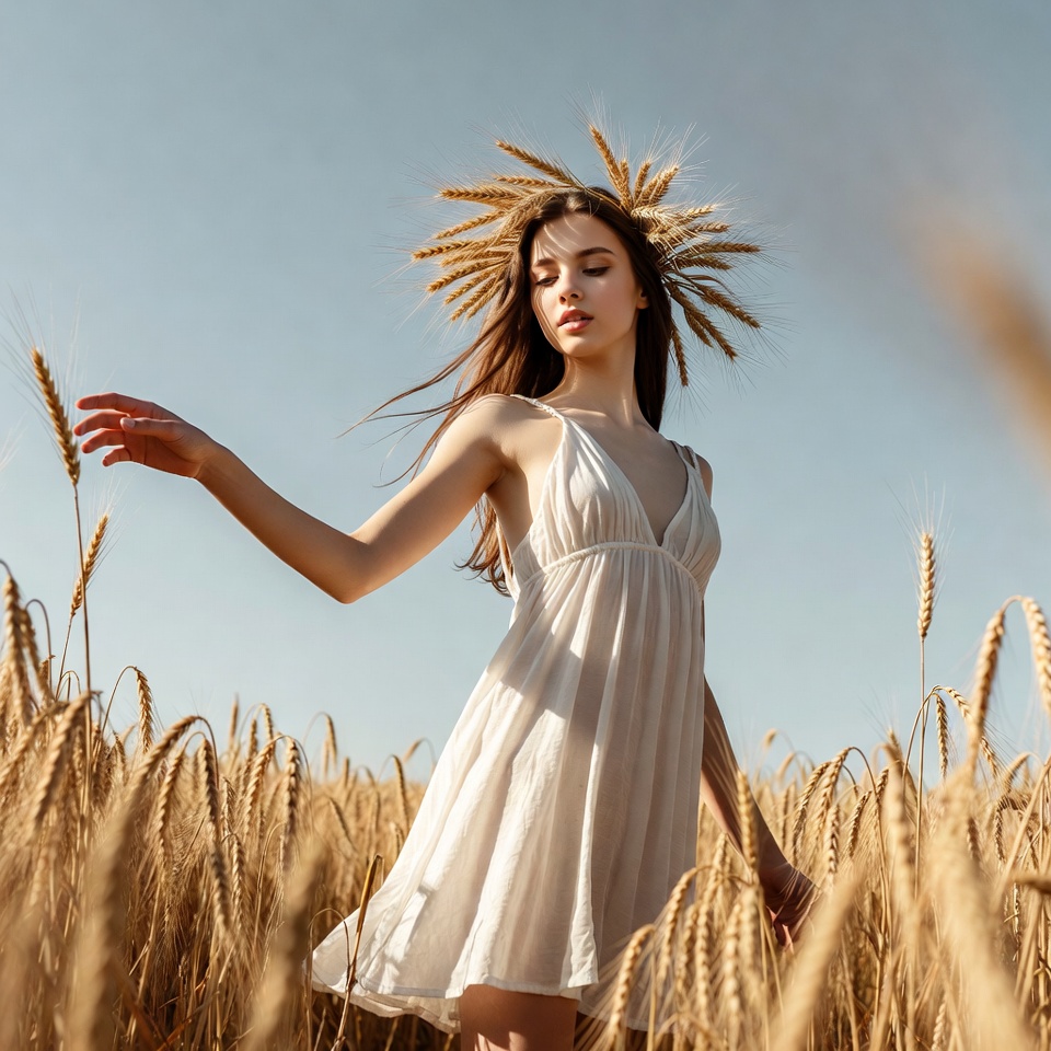 A young woman with long brown hair wears a large wheat crown on her head and a white spaghetti-strap dress. She stands in a golden wheat field under a clear blue sky, extending her arms gracefully with hands reaching out. Her expression is serene as she poses amidst the tall wheat stalks.