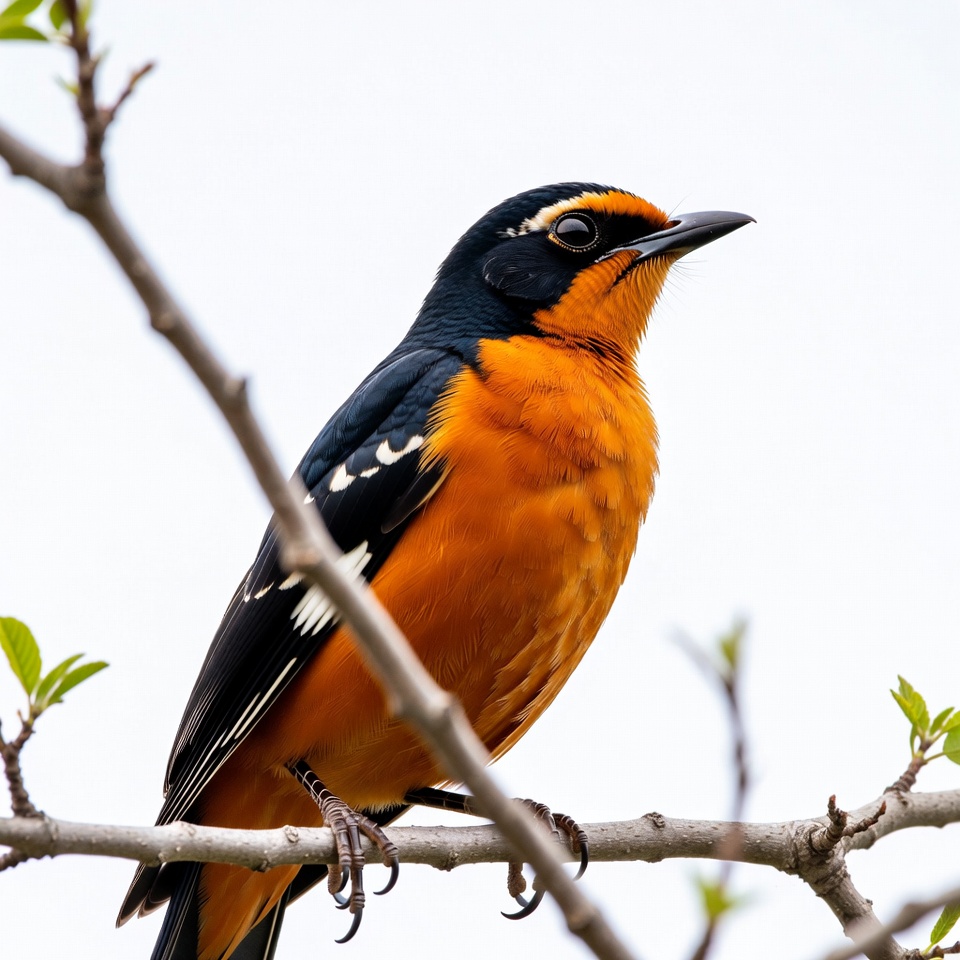 avian, black wings, bunting, feathers, green leaves, isolated background, nature, orange bird, perched, songbird, tree branch, tropical bird, white spots, wildlife, yellow eye-ring, bird