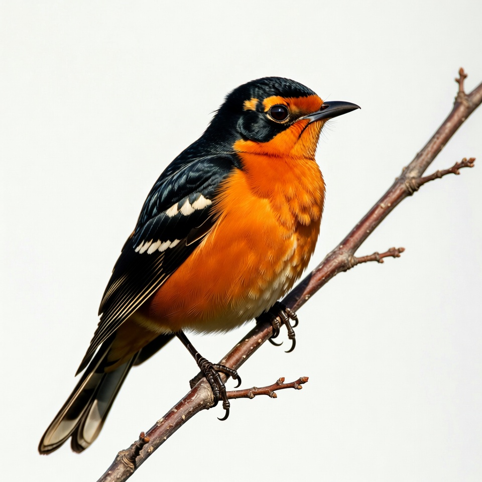 A vibrant Baltimore Oriole with striking orange underparts, black head, and white wing patches perches on a thin branch. Its bright orange eye ring and sharp beak are prominent against the white background. The bird grips the branch firmly with its claws.