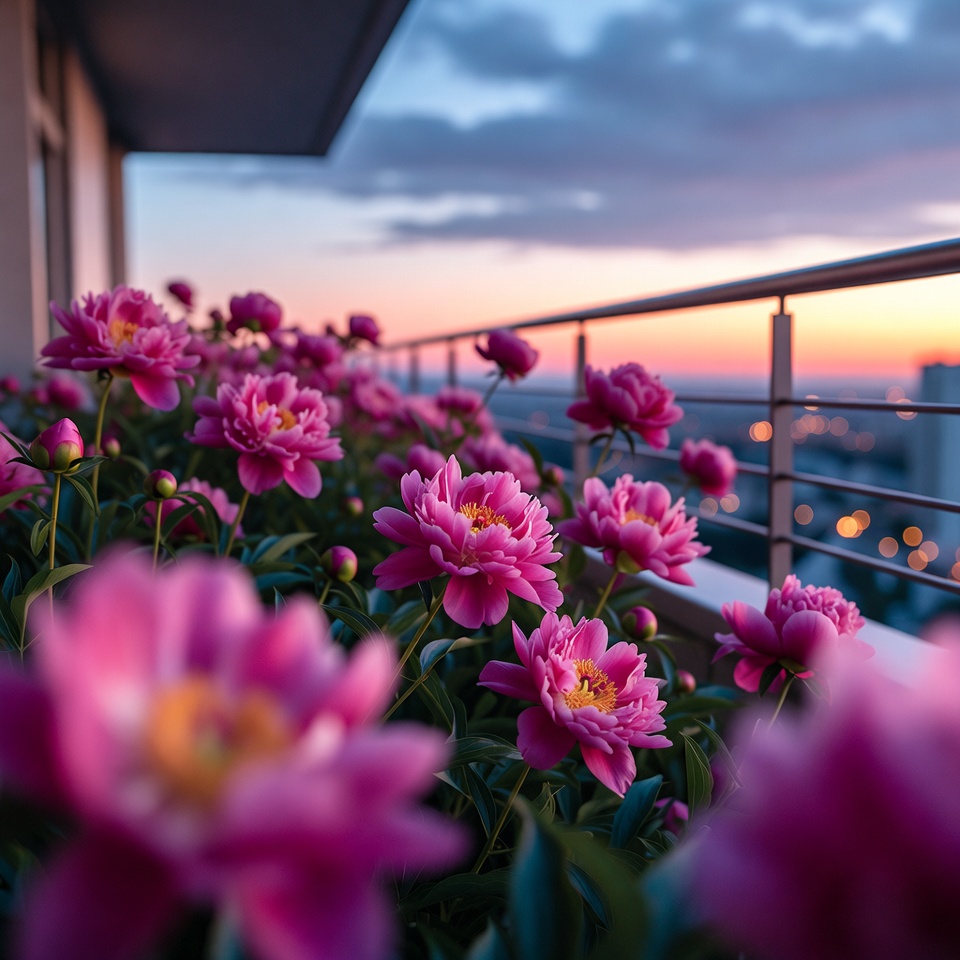 Vibrant pink peony flowers bloom abundantly in pots along a modern balcony railing. The scene captures a stunning sunset with orange and purple skies and distant city lights. A bokeh effect highlights the flowers against the blurred urban backdrop.