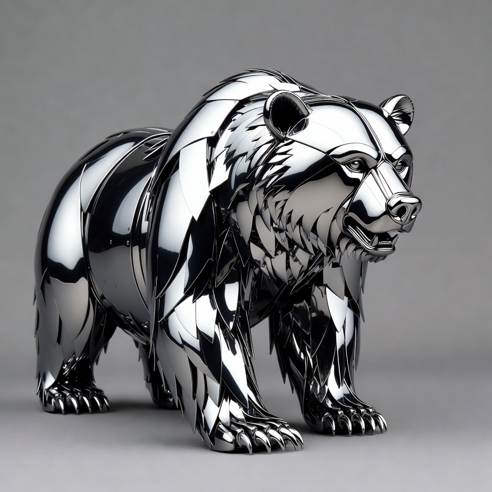 animal sculpture, bear figurine, bear paws, bear statue, detailed bear, fierce bear, grizzly sculpture, isolated background, metal art, metal fur, metal sculpture, polished metal, roaring bear, shiny bear, silver bear, stainless steel, standing bear, steel animal, wildlife art, grizzly bear