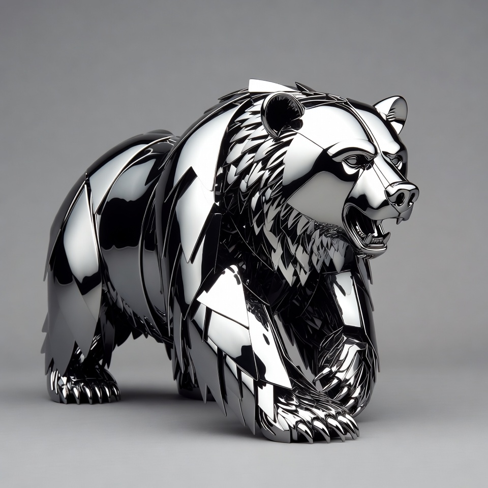 angular design, animal sculpture, art piece, bear statue, claws, fur texture, grizzly bear, isolated background, metal bear, metallic animal, roaring bear, sculpture, shiny metal, silver bear, steel sculpture, wildlife art, bear