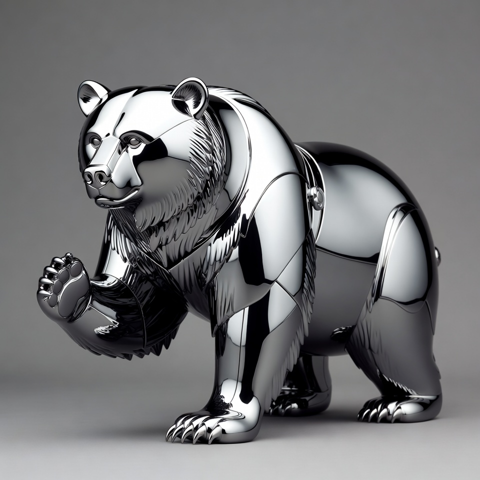 animal sculpture, bear figurine, chrome bear, detailed bear, grizzly bear, isolated background, metallic sculpture, polished metal, raised paw, realistic bear, shiny bear, silver bear, silver sculpture, standing bear, bear