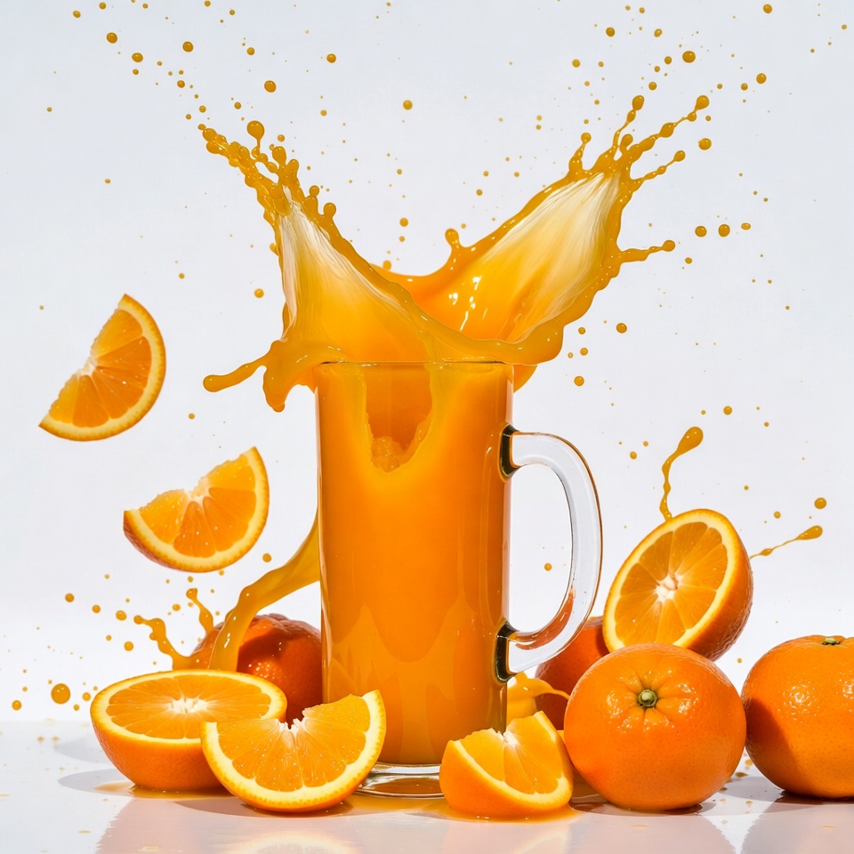 beverage, citrus fruit, citrus splash, dynamic splash, food photography, fresh oranges, fruit juice, fruit splash, glass mug, isolated, juice glass, juice mug, juice splash, liquid splash, orange drink, orange liquid, orange segments, orange slices, oranges, refreshing drink, splash effect, splashing juice, studio photo, white background, orange juice