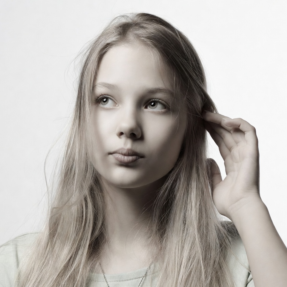 A young girl with long blonde hair gazes upward while gently touching her ear with her fingers. She has a subtle pout on her lips and wears a light-colored top with a necklace. The image is in black and white against a plain white background.