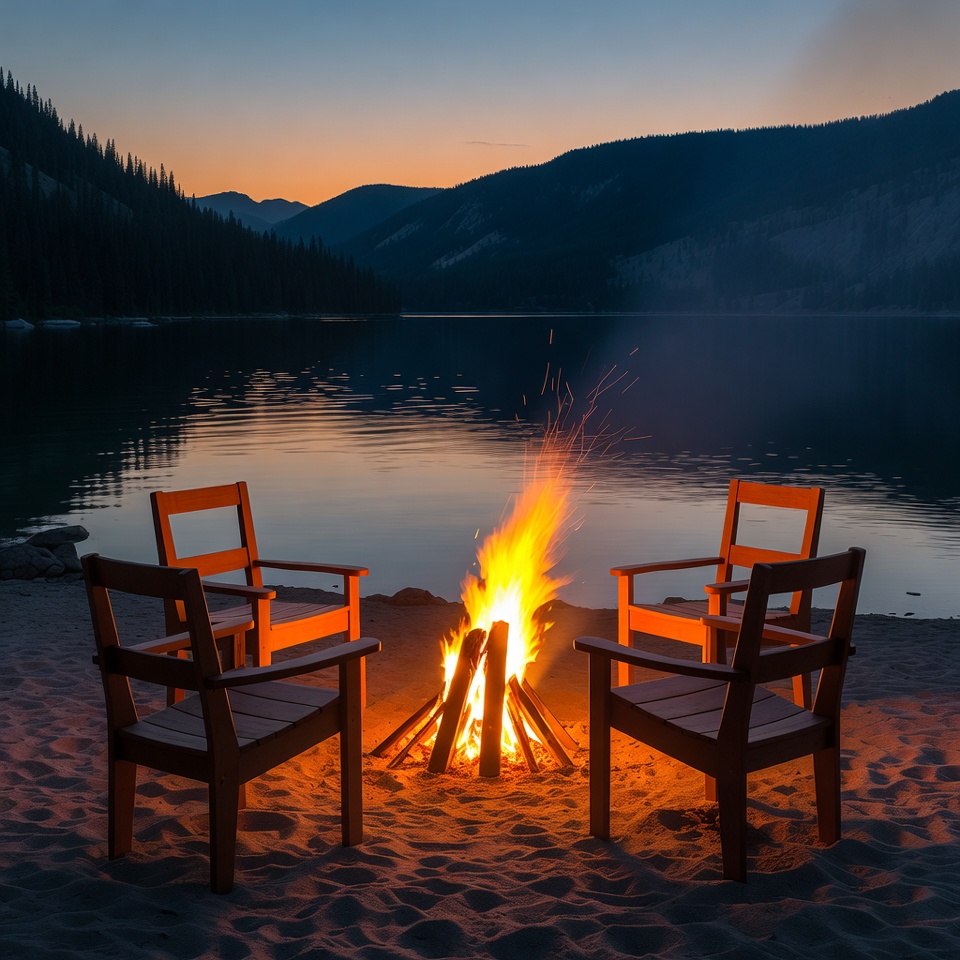 Two wooden Adirondack chairs face a glowing campfire on a sandy beach at twilight. Calm lake waters reflect the surrounding pine-covered mountains and colorful sunset sky. Orange flames flicker brightly against the darkening blue landscape.