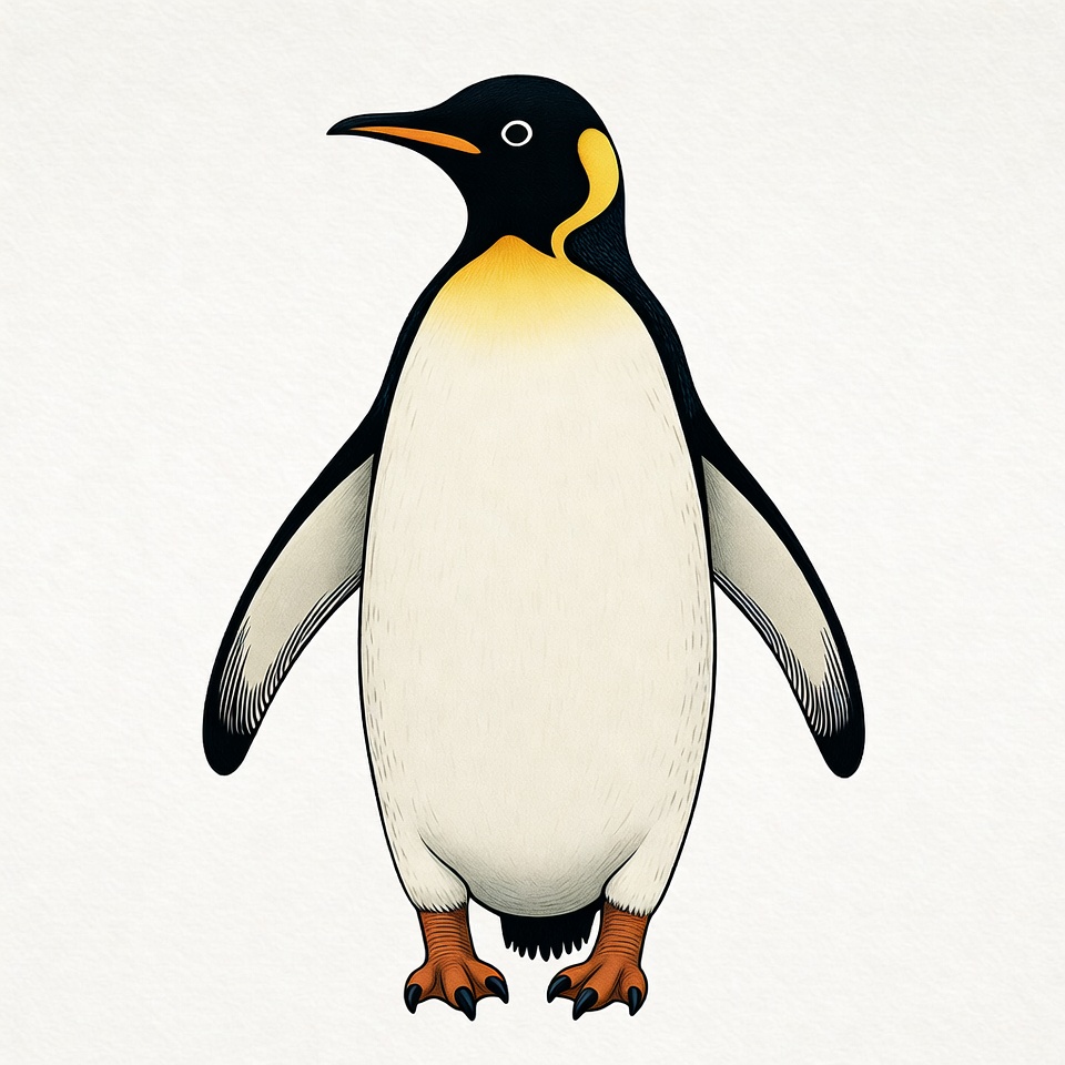 A detailed illustration of an emperor penguin stands on a white background. The penguin features black feathers on its head and back, a bright yellow patch on its neck, white belly, and orange feet. Its wings are slightly spread, showcasing the realistic feather texture.