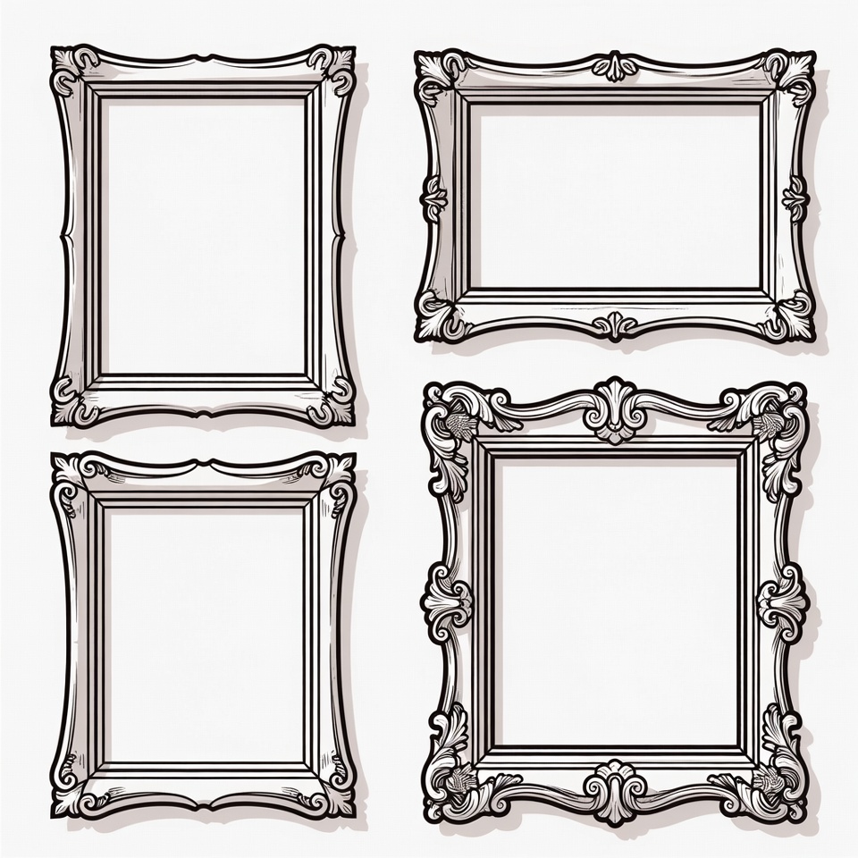 Four intricately designed empty picture frames are arranged in a grid on a white background. Each frame features elegant baroque-style scrolls and flourishes in black line art. The frames have blank rectangular spaces ready for images or artwork.