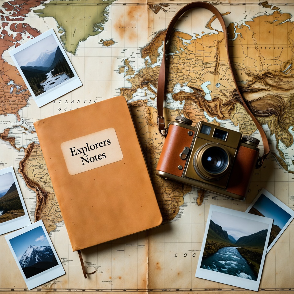 A vintage brown leather camera with strap rests on a large aged world map. Nearby is an open leather notebook labeled 'Explorers Notes' and several polaroid photos of mountains and rivers. The flat lay composition highlights travel adventure elements on a textured map background.