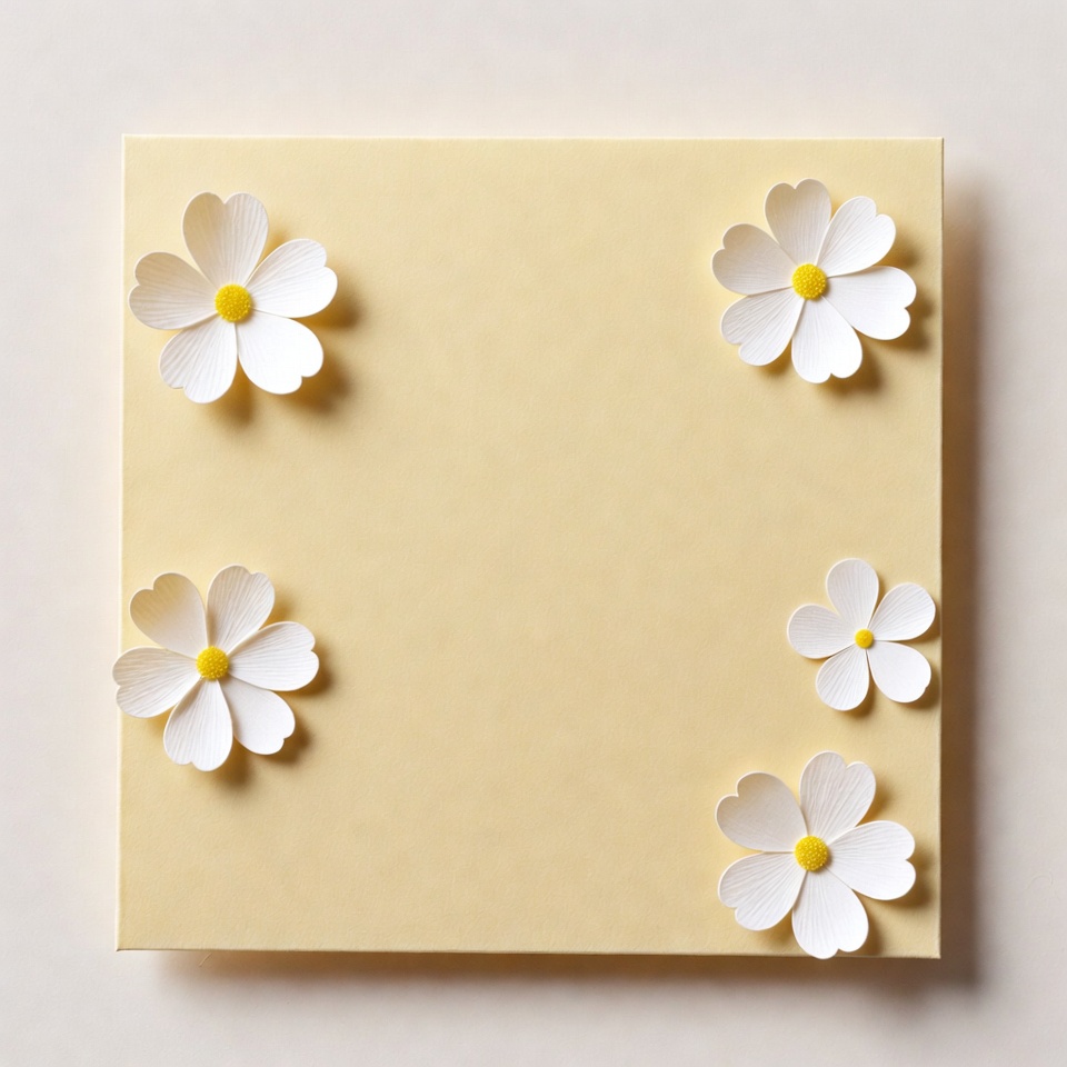 A square sheet of pale yellow paper features several white daisy flowers with yellow centers arranged around the edges. The flowers appear to be crafted from paper, creating a simple decorative design. The center of the paper remains blank.