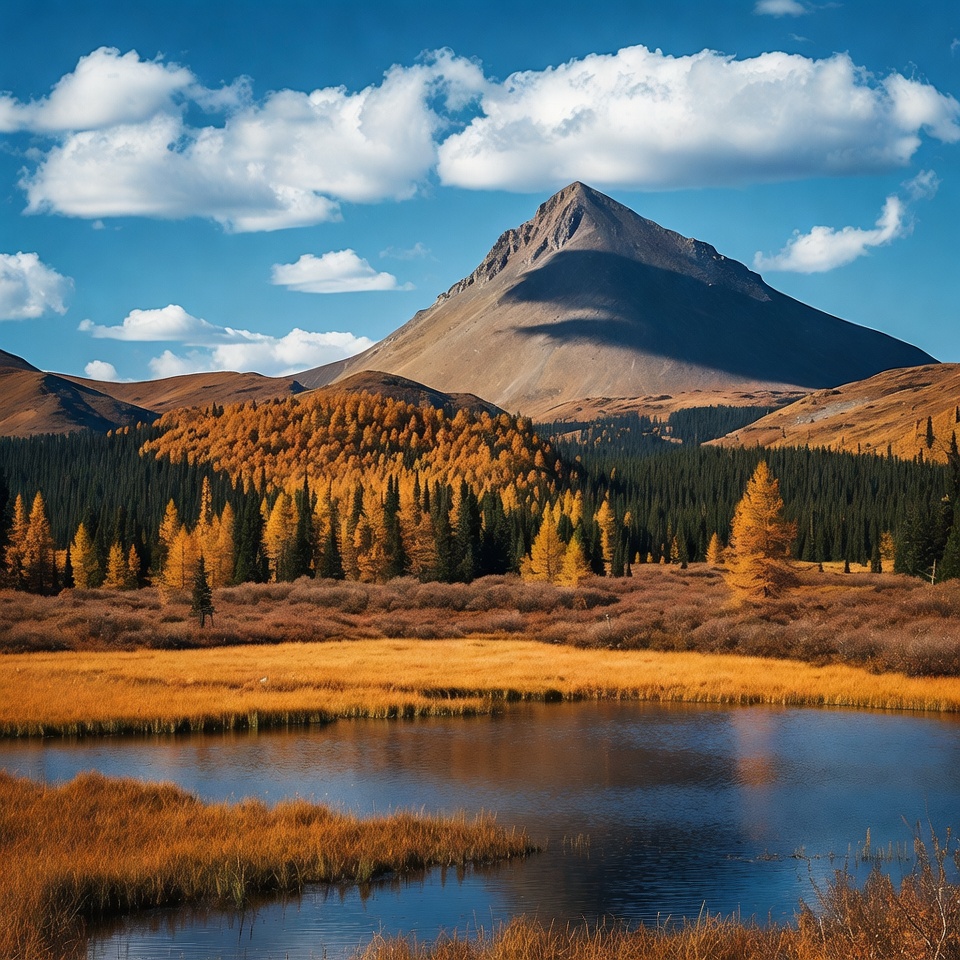 A tall, jagged mountain peak rises sharply against a clear blue sky dotted with white clouds. Golden autumn foliage covers the surrounding hills and trees, with a serene blue lake reflecting the scenery in the foreground. Tall grasses and shrubs in fall colors frame the landscape.