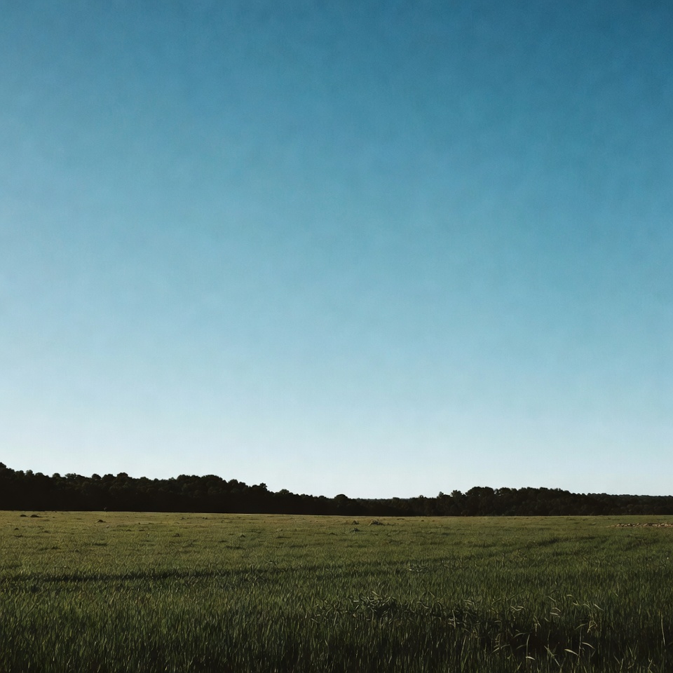 A vast green field stretches across the foreground under a clear blue sky. A line of dark green trees appears on the horizon. The scene features lush grass and open space with no people or structures.