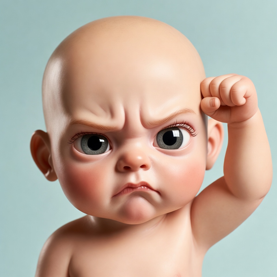 A bald baby with a fierce angry expression flexes one arm with a clenched fist raised to its head. The baby has large green eyes, rosy cheeks, and a frowning mouth on a light blue background. It appears as a detailed 3D illustration or sculpture.
