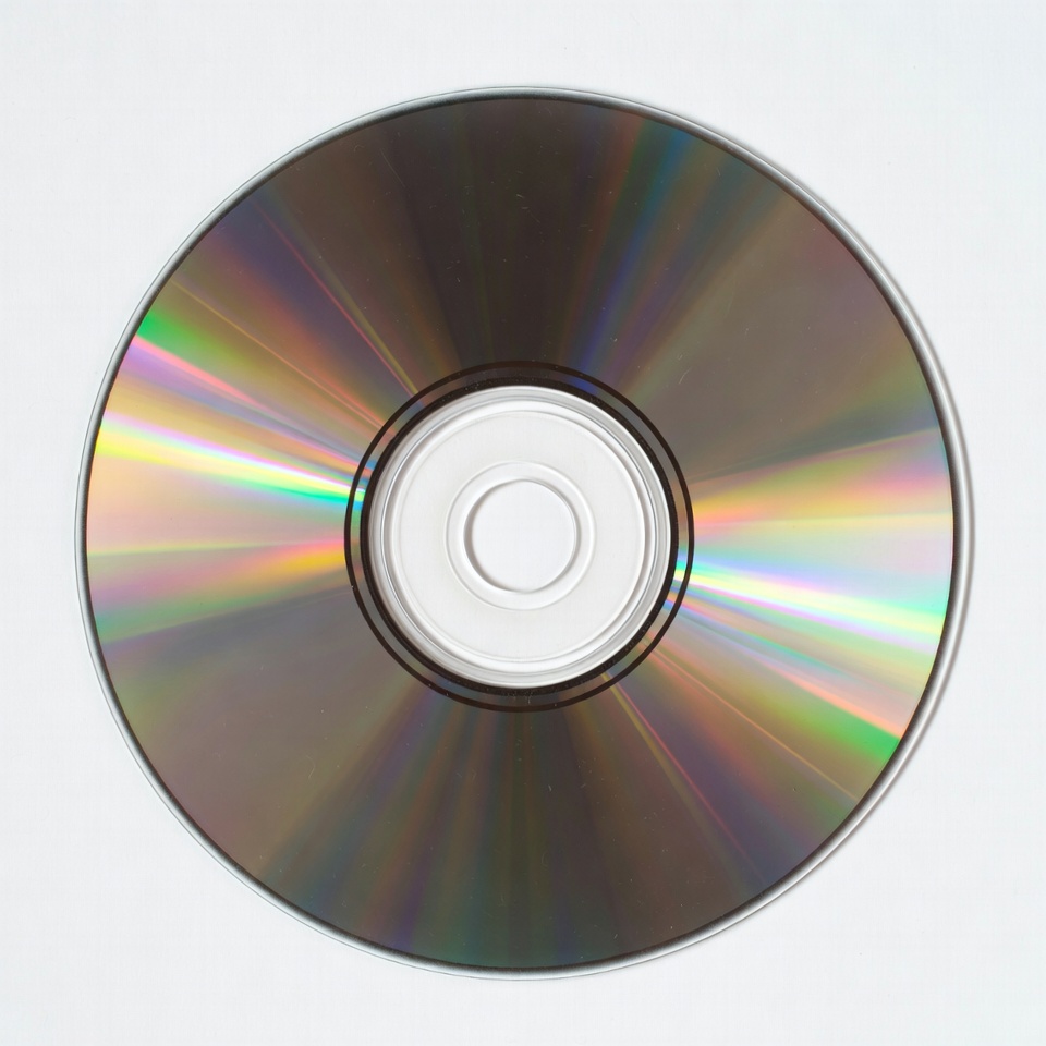 DVD, circular, close-up, compact disc, data storage, disc, iridescent, isolated, media, optical disc, rainbow colors, reflective, round, shiny, storage media, technology, white background, white hub, CD