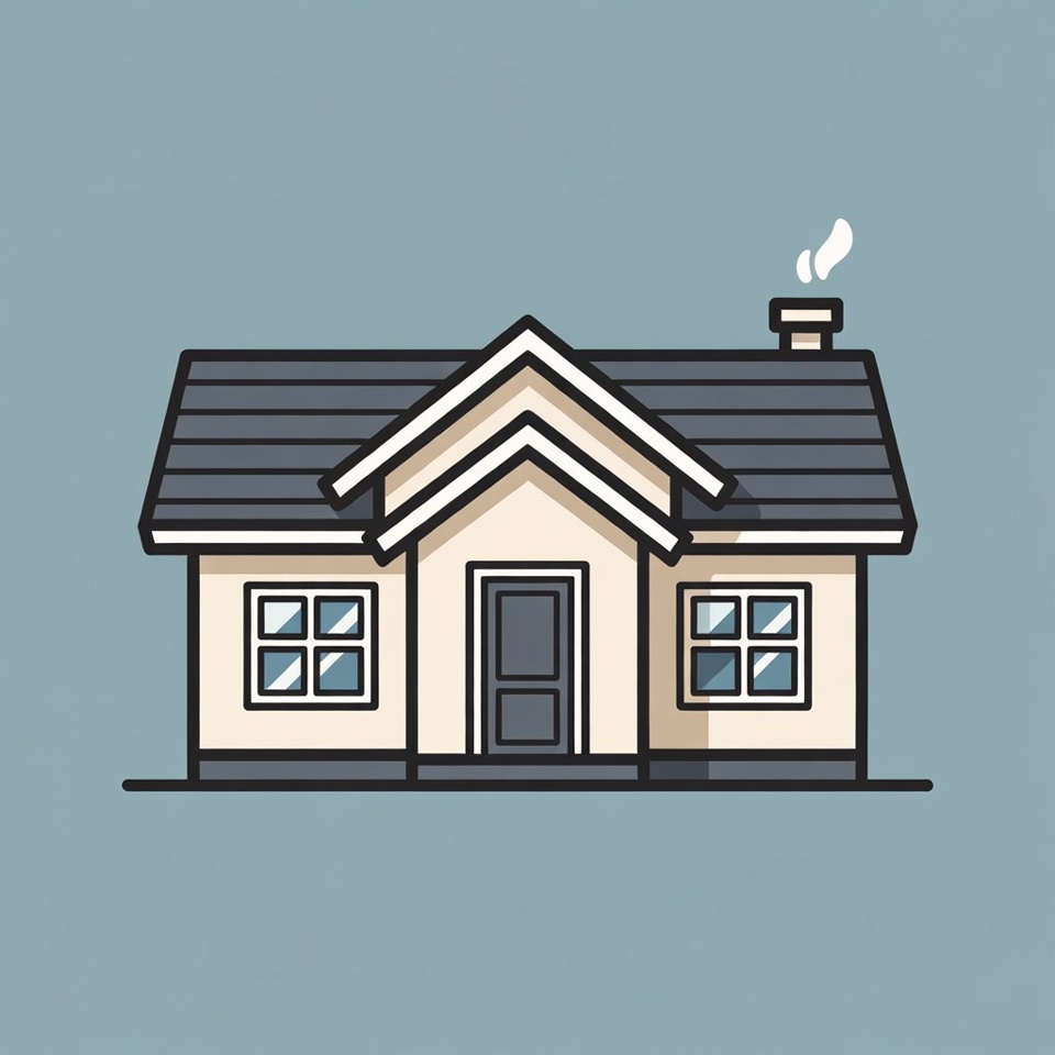 A simple line art illustration of a house features a gabled roof with gray shingles, beige walls, two windows, and a central black door. White smoke rises from the brick chimney on the roof. The house is centered on a light blue background.