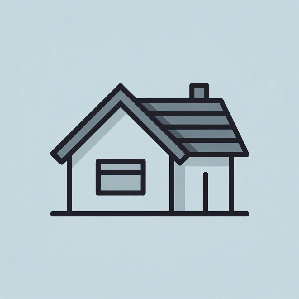 A simple line art illustration of a house on a light blue background. The house features a sloped roof with stripes, a chimney, a rectangular window, and a door on the side. It is depicted in black outlines with gray shading.