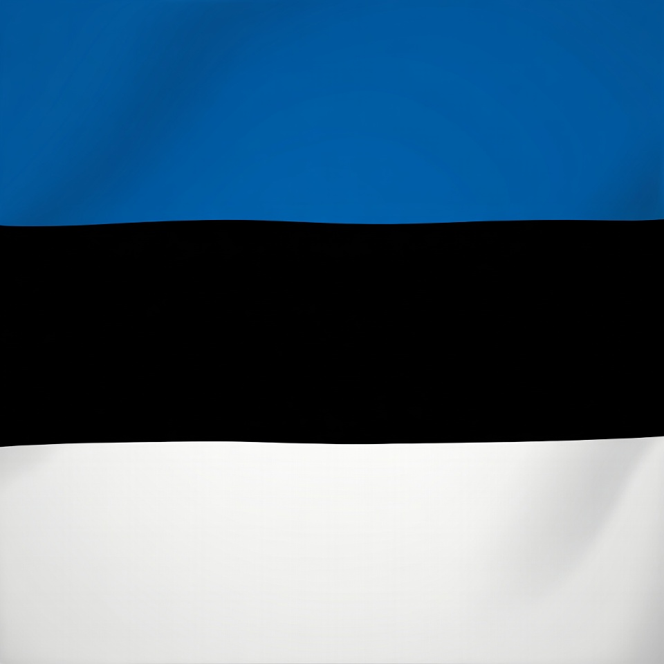The Estonian national flag features three horizontal stripes of blue, black, and white. The fabric appears to be waving gently, creating folds and texture. It is displayed against an isolated background.