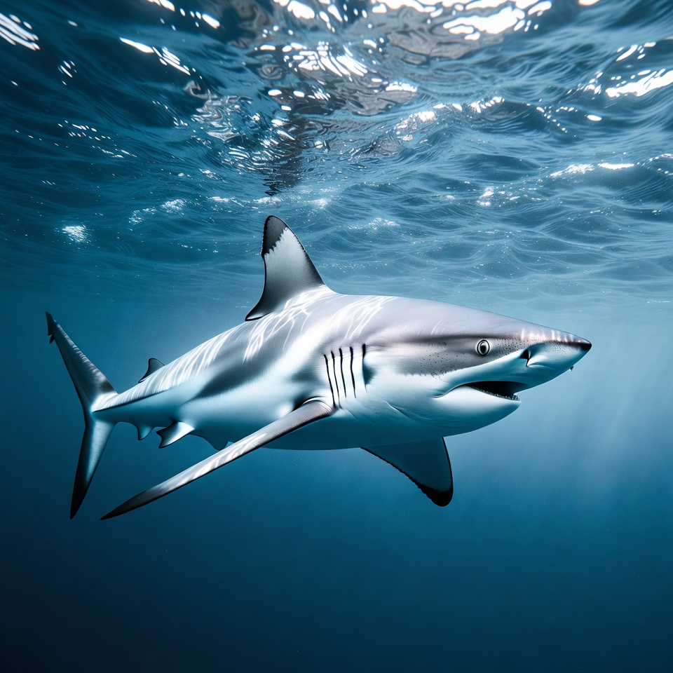 A blacktip shark swims gracefully through clear blue ocean water. Its sleek body features distinctive black tips on the fins, with a white underbelly and open mouth revealing sharp teeth. The scene captures rippling water surfaces and underwater light rays.