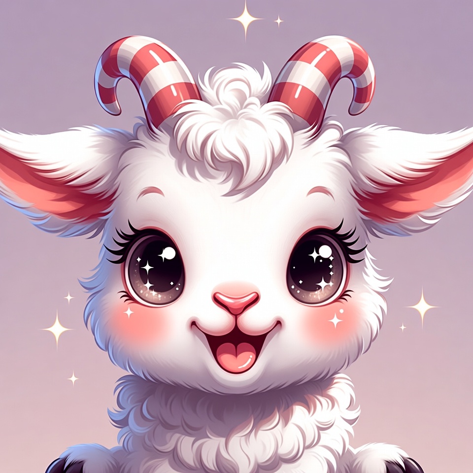 A chibi-style illustrated white goat features large sparkling eyes and a happy smile. Its horns are wrapped in red and white candy cane stripes, with pink blushing cheeks and fluffy fur. Sparkles surround the adorable animal on a soft pink background.