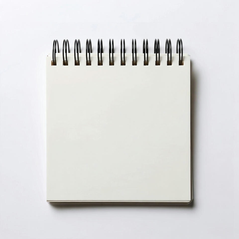 A white spiral-bound notebook with blank pages lies open on a white background. The black metal spiral binding is visible along the top edge. The notebook is centered and viewed from directly above.