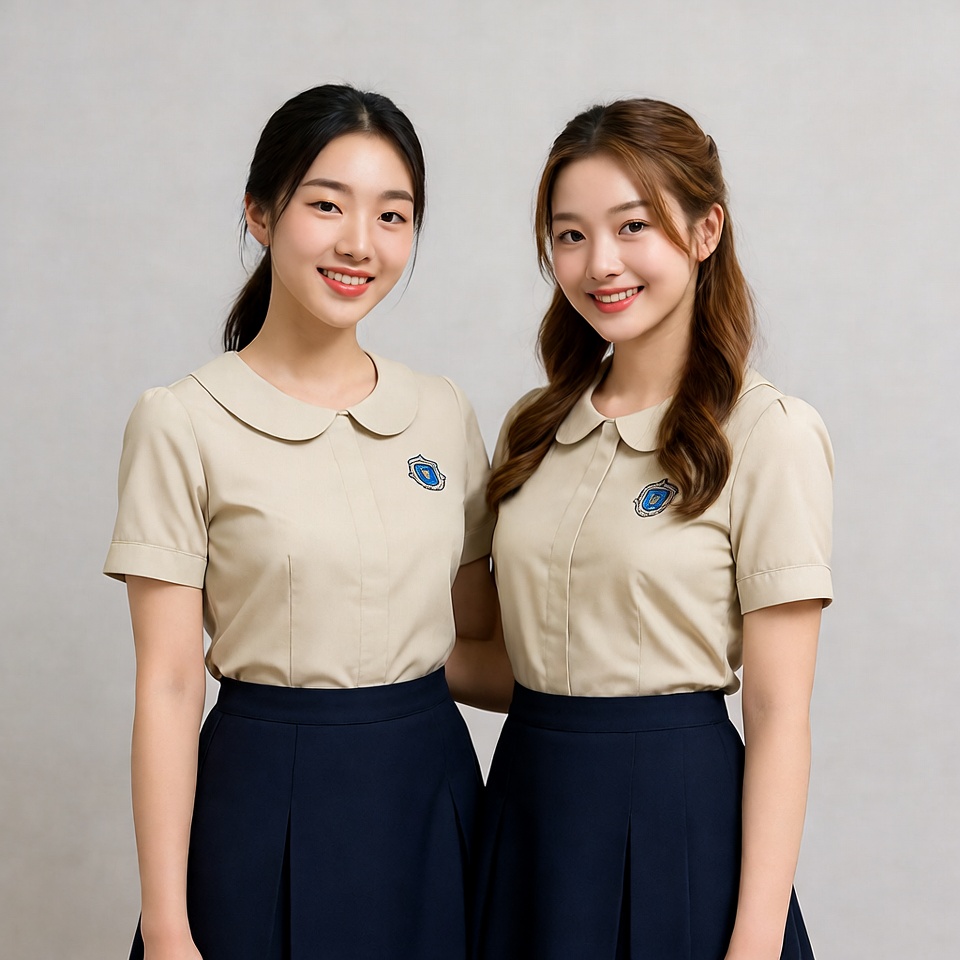 Two young Asian women with long dark hair stand smiling side by side against a plain gray background. They wear matching beige short-sleeve collared blouses with blue school badges and navy blue pleated skirts. Both have ponytails and cheerful expressions.