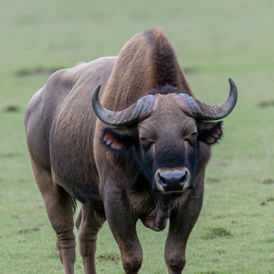 animal, brown coat, buffalo, curved horns, field, grass, grazing area, green grass, horns, large animal, mammal, nature, outdoors, savanna, standing, wet fur, wildlife, water buffalo