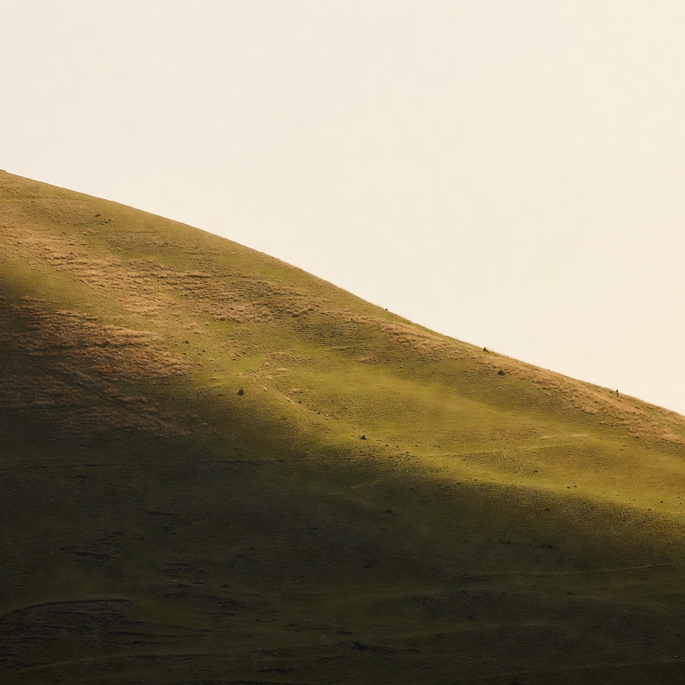 A grassy hill slopes upward against a pale sky, illuminated by warm golden sunlight. Shadows and highlights accentuate the contours of the green grass. The scene features a natural landscape with subtle texture in the terrain.