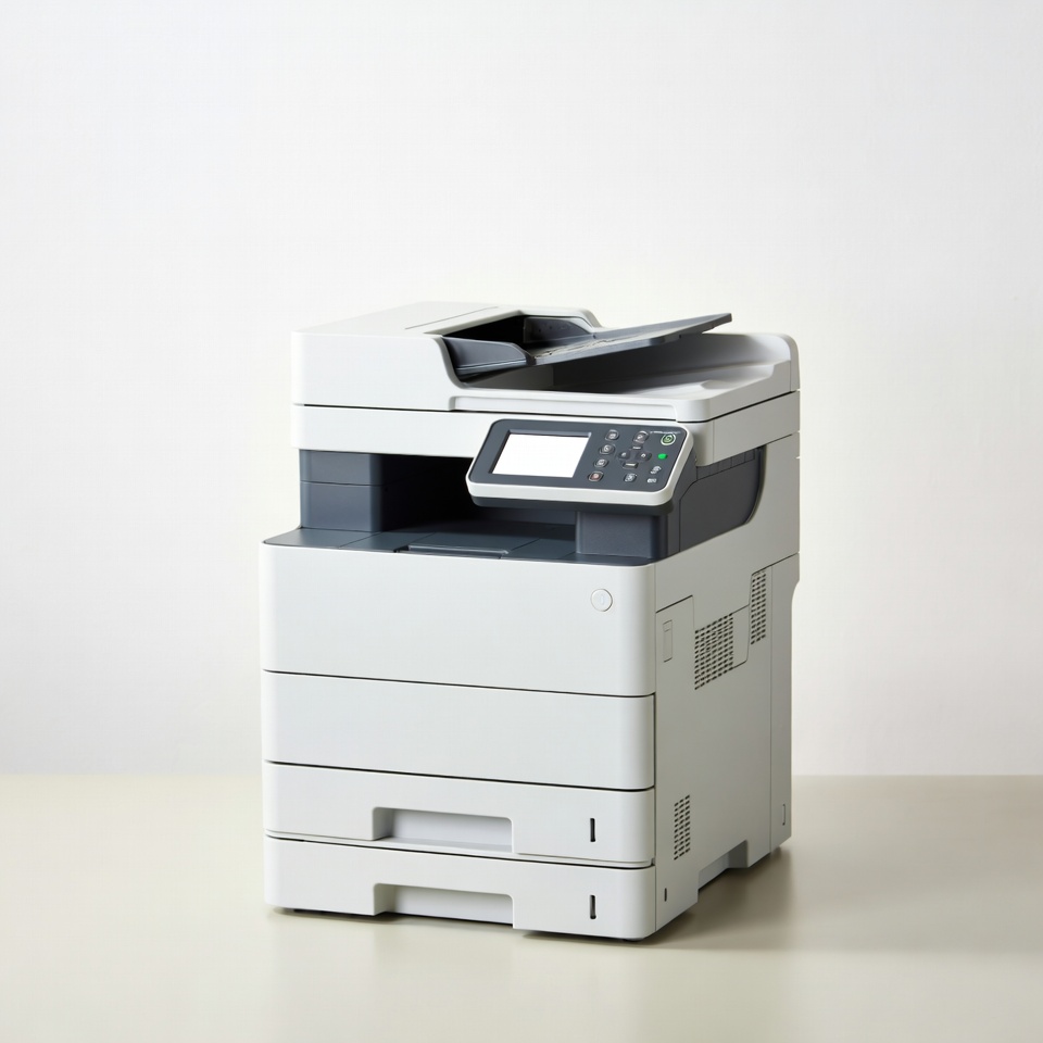 all-in-one printer, copier, digital display, isolated background, machine, modern printer, multifunction printer, office equipment, office printer, paper tray, photocopier, scanner, white background, white printer, printer