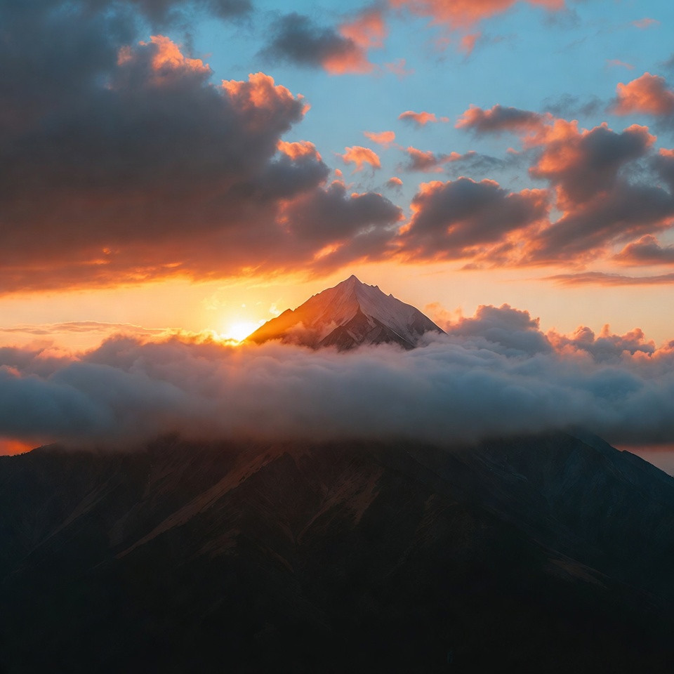 A dramatic sunrise illuminates a sharp, snow-capped mountain peak emerging from thick clouds. The sun's orange rays contrast with the blue and pink sky filled with scattered clouds. Dark mountain slopes frame the glowing summit below the vibrant horizon.