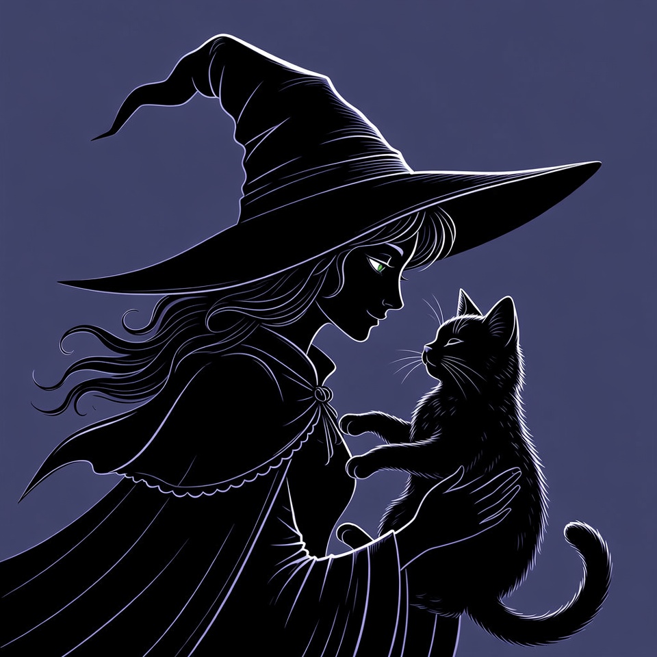 A silhouette illustration of a woman dressed as a witch with a tall pointed hat and flowing cape holds a small black kitten. She has long wavy hair and green glowing eyes in profile view. The artwork features intricate line art on a dark purple background.