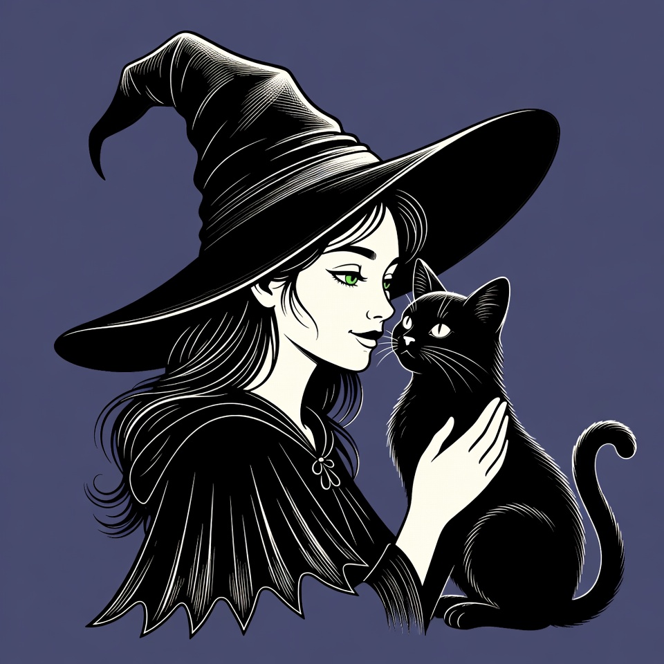 A detailed black ink illustration features a pale woman with long dark hair wearing a large pointed black witch hat and cloak. She gently holds a black cat close to her face, both gazing at each other with green eyes. The artwork is set against a dark purple background.