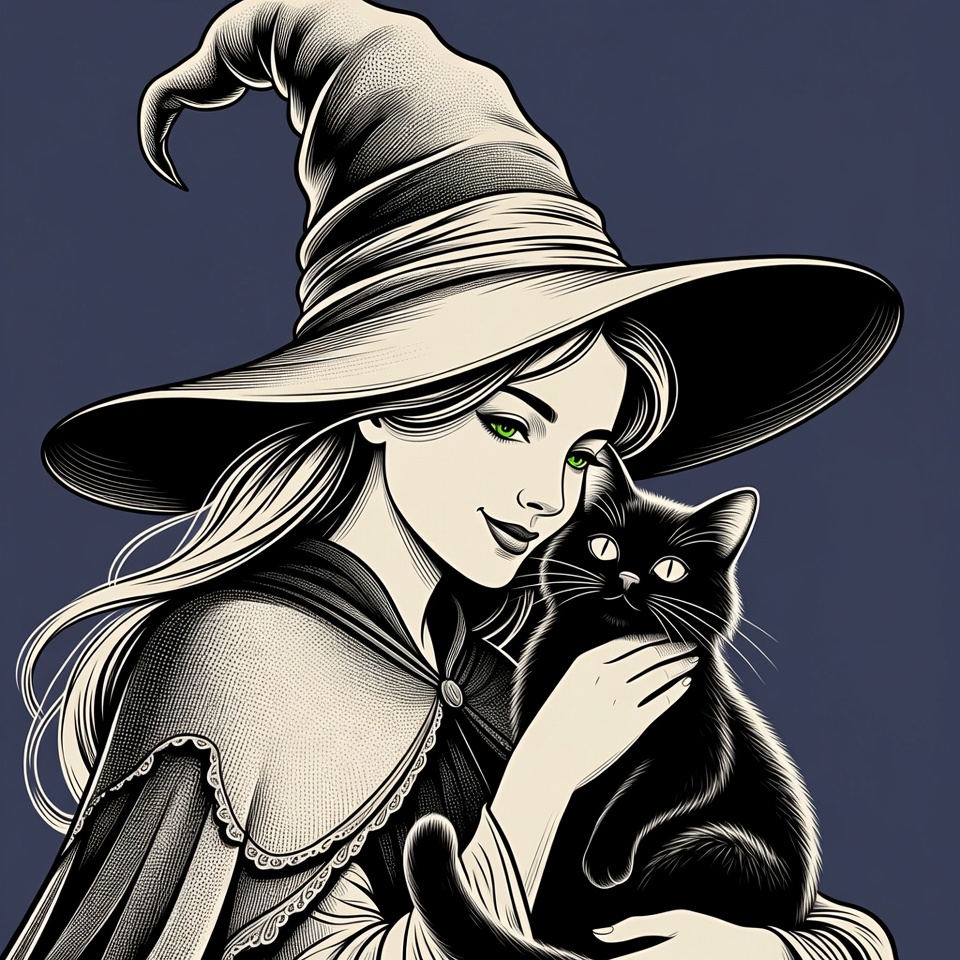 An illustrated young woman dressed as a witch with a tall pointed hat and flowing blonde hair holds a black cat close to her chest. She has green eyes and a gentle smile, wearing a hooded cape over her outfit. The artwork features a dark navy background with detailed line art style.
