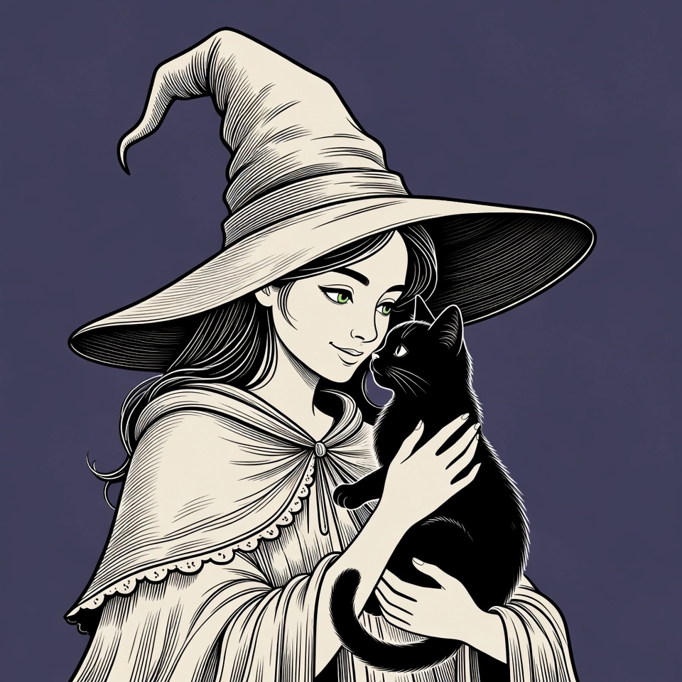 Halloween, White, black cat, cape, dark background, fantasy, female, green eyes, holding cat, illustration, ink art, line art, long hair, magic, pointed hat, purple background, smiling, witch hat, woman, young woman, witch