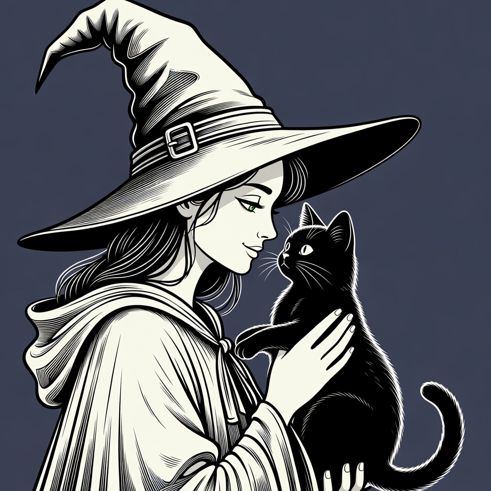 Halloween, black cat, black witch hat, cartoon witch, cute witch, dark background, dark hair, familiar cat, fantasy, female witch, green eyes, holding pet, hooded cloak, illustration, line art, magic, mystical, petting cat, pointed hat, profile view, spooky, woman, witch