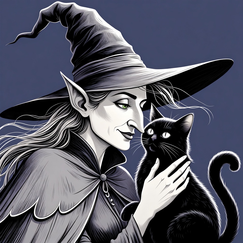 Halloween, animal, black cat, cat face, creature, dark background, elf ears, familiar, fantasy, gothic, gray cloak, green skin, holding cat, illustration, line art, long hair, magic, mystical, noses touching, pointed hat, sorceress, spooky, white hair, woman, witch