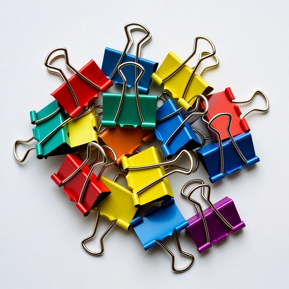 assorted colors, blue clips, circular arrangement, clip arrangement, colorful clips, desktop accessories, green clips, metal clips, office supplies, orange clips, organized clips, paper clips, purple clips, red clips, silver clips, stationery, vibrant colors, white background, yellow clips, binder clips