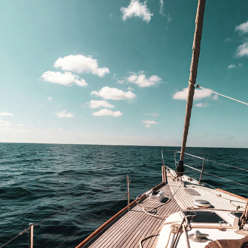 blue sky, boat, boating, clouds, deck, horizon, marine, mast, nautical, ocean, railing, ropes, sail, sailing, sea, seascape, teak wood, vessel, voyage, water, waves, winches, yacht, sailboat