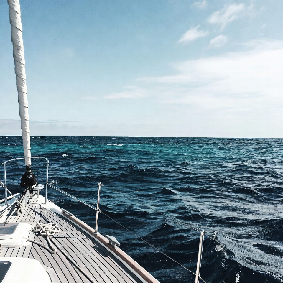 blue sky, boat, boating, clouds, deck, horizon, marine, mast, nautical, ocean, rigging, sail, sailing, sails, sea, turquoise water, vessel, water, waves, white sails, wooden deck, yacht, sailboat