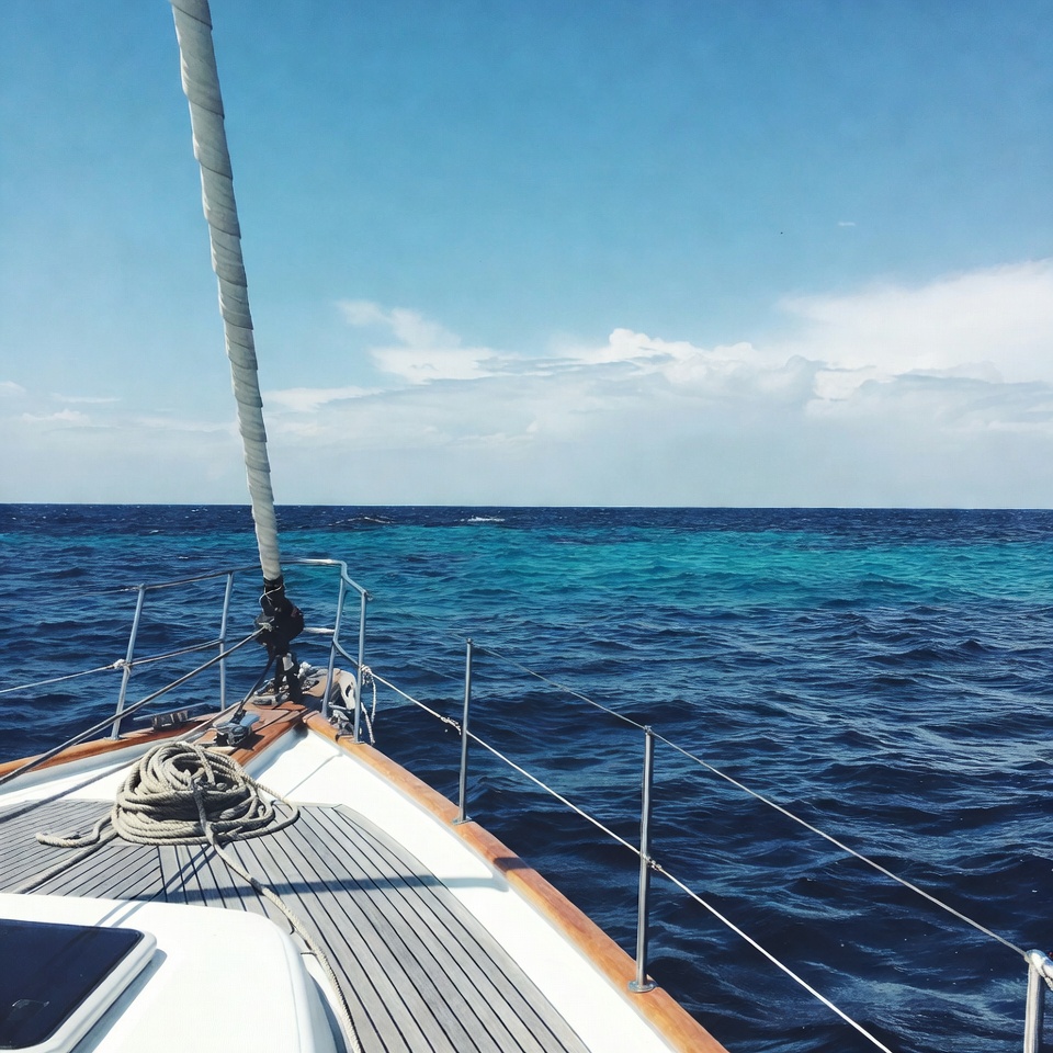 A white sailboat with a tall mast and coiled ropes sails on a calm turquoise ocean under a clear blue sky. Gentle waves lap against the wooden deck and stainless steel railings. Distant clouds and horizon are visible in the background.