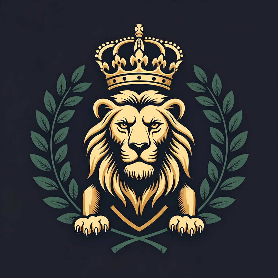 A majestic golden lion head with a detailed crown sits centered on a dark background. Green laurel branches frame the lion on both sides, crossed at the bottom. The illustration features intricate line work and shading for a regal emblem design.