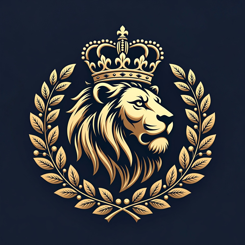 A majestic lion head faces forward in gold tones on a dark navy background. It wears an ornate golden crown and is encircled by intricate laurel wreath branches. The design features detailed fur texture and fierce eyes.